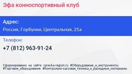 Эфа, конноспортивный клуб по адресу Конно-спортивный клуб "Эфа", Центральная улица, Низино, Низинское сельское поселение, Ломоносовский район, Ленинградская область, Северо-Западный федеральный округ, 188501, Россия в дальнейшем Организация, размещена в следующих категориях: