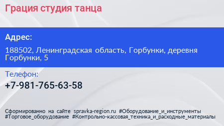 Грация, студия танца по адресу 188502, Ленинградская область, Горбунки, деревня Горбунки, 5 в дальнейшем Организация, размещена в следующих категориях: