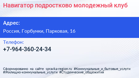 Навигатор, подростково-молодежный клуб по адресу Подростково-молодежный клуб «Навигатор», 16, Парковая улица, ЖК «Новый Петергоф», Луизино, Петергоф, Санкт-Петербург, Северо-Западный федеральный округ, 198510, Россия в дальнейшем Организация, размещена в следующих категориях:
