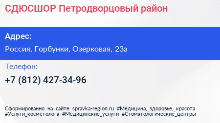 СДЮСШОР, Петродворцовый район по адресу Cпортивная школа олимпийского резерва Петродворцового района, улица Путешественника Козлова, Луизино, Петергоф, Санкт-Петербург, Северо-Западный федеральный округ, 198516, Россия в дальнейшем Организация, размещена в следующих категориях: