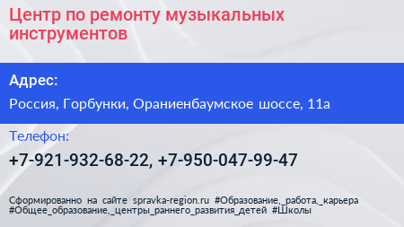Центр по ремонту музыкальных инструментов по адресу Храм преподобного Серафима Саровского, 11 литА, Ораниенбаумское шоссе, Просвещение, Петергоф, Санкт-Петербург, Северо-Западный федеральный округ, 198504, Россия в дальнейшем Организация, размещена в следующих категориях: