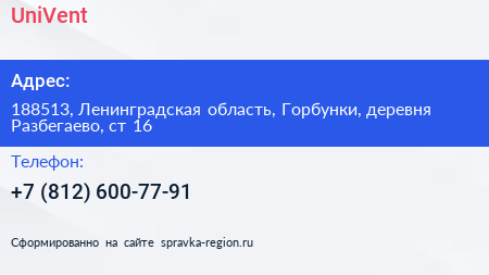 UniVent по адресу 188513, Ленинградская область, Горбунки, деревня Разбегаево, ст 16 в дальнейшем Организация, размещена в следующих категориях: