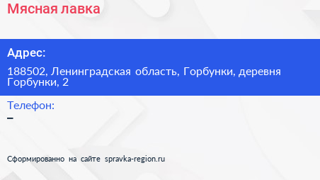 Мясная лавка по адресу 188502, Ленинградская область, Горбунки, деревня Горбунки, 2 в дальнейшем Организация, размещена в следующих категориях: