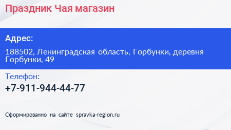 Праздник Чая, магазин по адресу 188502, Ленинградская область, Горбунки, деревня Горбунки, 49 в дальнейшем Организация, размещена в следующих категориях:
