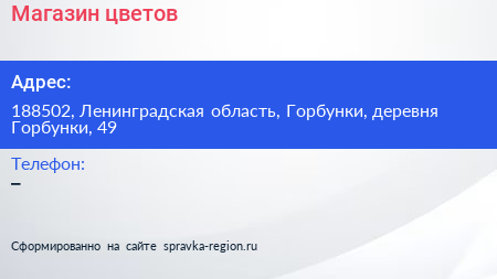 Магазин цветов по адресу 188502, Ленинградская область, Горбунки, деревня Горбунки, 49 в дальнейшем Организация, размещена в следующих категориях: