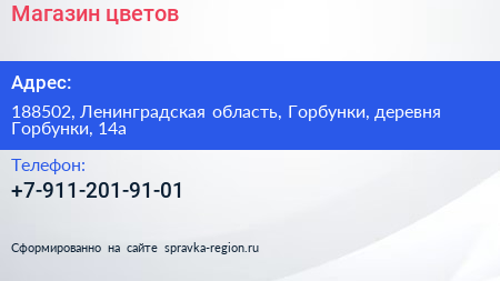 Магазин цветов по адресу 188502, Ленинградская область, Горбунки, деревня Горбунки, 14а в дальнейшем Организация, размещена в следующих категориях: