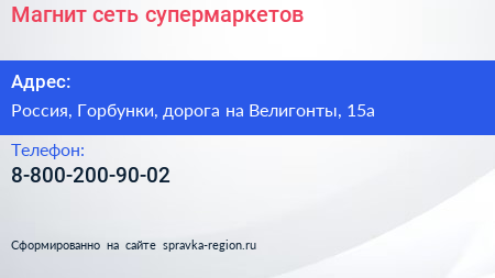 Магнит, сеть супермаркетов по адресу Магнит, Дорога на Велигонты, Разбегаево, Горбунковское сельское поселение, Ломоносовский район, Ленинградская область, Северо-Западный федеральный округ, 188513, Россия в дальнейшем Организация, размещена в следующих категориях: