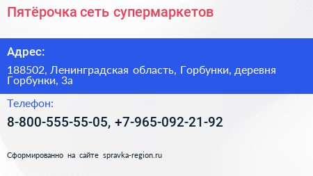Пятёрочка, сеть супермаркетов по адресу 188502, Ленинградская область, Горбунки, деревня Горбунки, 3а в дальнейшем Организация, размещена в следующих категориях: