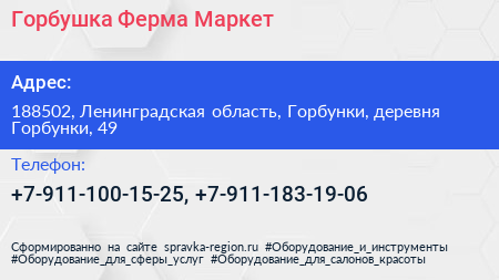 Горбушка Ферма Маркет по адресу 188502, Ленинградская область, Горбунки, деревня Горбунки, 49 в дальнейшем Организация, размещена в следующих категориях: