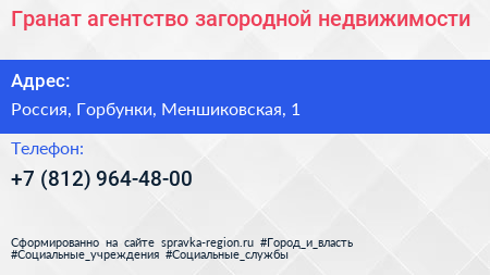 Гранат, агентство загородной недвижимости по адресу Меншиковская улица, Дмитрово, Низино, Низинское сельское поселение, Ломоносовский район, Ленинградская область, Северо-Западный федеральный округ, 188501, Россия в дальнейшем Организация, размещена в следующих категориях: