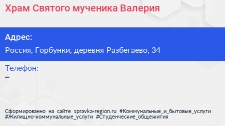 Храм Святого мученика Валерия по адресу Церковь Валерия, Стрельнинское шоссе, Разбегаево, Горбунковское сельское поселение, Ломоносовский район, Ленинградская область, Северо-Западный федеральный округ, Россия в дальнейшем Организация, размещена в следующих категориях: