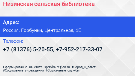 Для связи с организацией воспользуйтесь номером телефона: +7 (81376) 5-20-55, +7-952-217-33-07. Пн: выходной, Вт: c 12:00-18:00, Ср: c 12:00-18:00, Чт: c 12:00-17:00, Пт: c 12:00-18:00, Сб: c 12:00-17:00, Вс: выходной. санитарный день: последний день месяца, вы можете обратиться в эту организацию.
