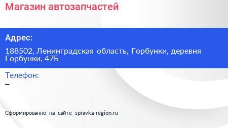 Магазин автозапчастей по адресу 188502, Ленинградская область, Горбунки, деревня Горбунки, 47Б в дальнейшем Организация, размещена в следующих категориях: