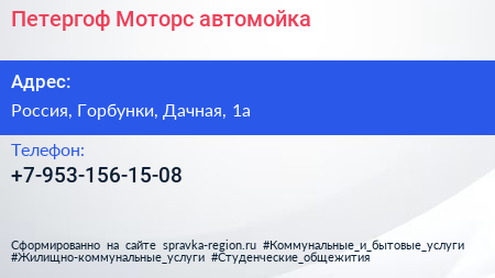 Петергоф-Моторс, автомойка по адресу Петергоф Моторс, Дачная улица, Сашино, Низинское сельское поселение, Ломоносовский район, Ленинградская область, Северо-Западный федеральный округ, 188501, Россия в дальнейшем Организация, размещена в следующих категориях:
