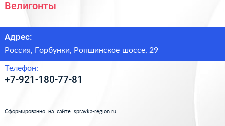 Велигонты по адресу Шиномонтаж Mobil 1 центр, Ропшинское шоссе, Горбунковское сельское поселение, Ломоносовский район, Ленинградская область, Северо-Западный федеральный округ, 188513, Россия в дальнейшем Организация, размещена в следующих категориях:
