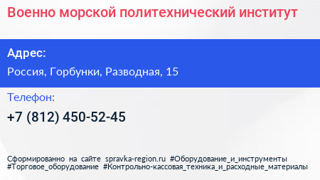 Военно-морской политехнический институт по адресу Военно-Морской институт радиоэлектроники имени Александра Степановича Попова, 15, Разводная улица, Заячий Ремиз, Петергоф, Санкт-Петербург, Северо-Западный федеральный округ, 198516, Россия в дальнейшем Организация, размещена в следующих категориях: