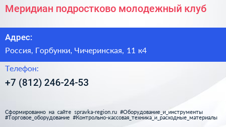 Меридиан, подростково-молодежный клуб по адресу Подростково-молодежный клуб «Меридиан», 11 к4, Чичеринская улица, 23-й квартал, Старый Петергоф, Петергоф, Санкт-Петербург, Северо-Западный федеральный округ, 198504, Россия в дальнейшем Организация, размещена в следующих категориях: