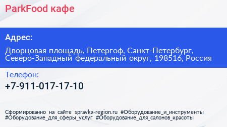 ParkFood, кафе по адресу Дворцовая площадь, Петергоф, Санкт-Петербург, Северо-Западный федеральный округ, 198516, Россия в дальнейшем Организация, размещена в следующих категориях: