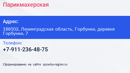 Парикмахерская по адресу 188502, Ленинградская область, Горбунки, деревня Горбунки, 7 в дальнейшем Организация, размещена в следующих категориях: