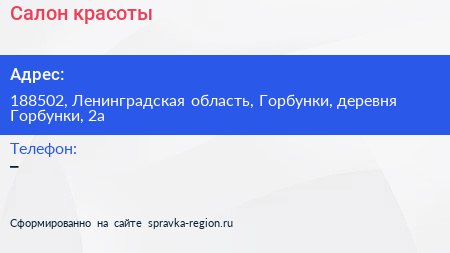 Салон красоты по адресу 188502, Ленинградская область, Горбунки, деревня Горбунки, 2а в дальнейшем Организация, размещена в следующих категориях:
