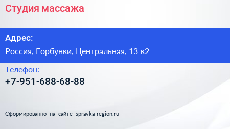 Студия массажа по адресу 13 к2, Центральная улица, Низино, Низинское сельское поселение, Ломоносовский район, Ленинградская область, Северо-Западный федеральный округ, 188501, Россия в дальнейшем Организация, размещена в следующих категориях: