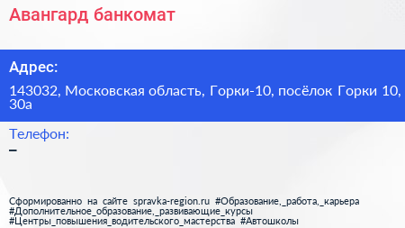 Авангард, банкомат по адресу 143032, Московская область, Горки-10, посёлок Горки 10, 30а в дальнейшем Организация, размещена в следующих категориях: