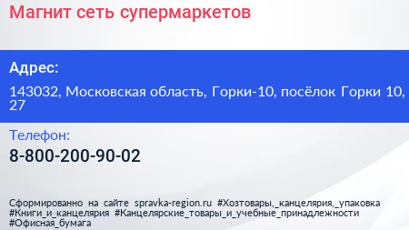 Магнит, сеть супермаркетов по адресу 143032, Московская область, Горки-10, посёлок Горки 10, 27 в дальнейшем Организация, размещена в следующих категориях: