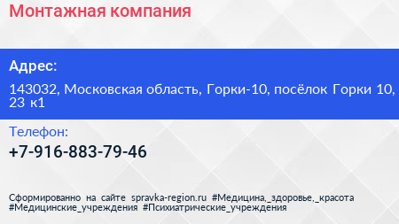 Монтажная компания по адресу 143032, Московская область, Горки-10, посёлок Горки 10, 23 к1 в дальнейшем Организация, размещена в следующих категориях: