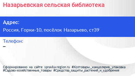 Назарьевская сельская библиотека по адресу Культурно-спортивный комплекс "Назарьевский", с37, А-106, Назарьево, Одинцовский городской округ, Московская область, Центральный федеральный округ, 143021, Россия в дальнейшем Организация, размещена в следующих категориях: