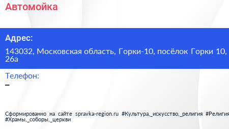Автомойка по адресу 143032, Московская область, Горки-10, посёлок Горки 10, 26а в дальнейшем Организация, размещена в следующих категориях: