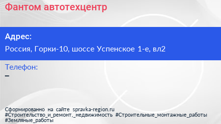 Фантом, автотехцентр по адресу вл2, 1-е Успенское шоссе, посёлок дома отдыха "Успенское", Сосны, Одинцовский городской округ, Московская область, Центральный федеральный округ, 143030, Россия в дальнейшем Организация, размещена в следующих категориях: