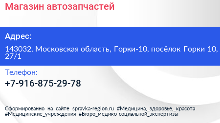 Магазин автозапчастей по адресу 143032, Московская область, Горки-10, посёлок Горки 10, 27/1 в дальнейшем Организация, размещена в следующих категориях: