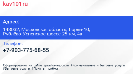 kav101.ru по адресу 143032, Московская область, Горки-10, Рублёво-Успенское шоссе 25 км, 4а в дальнейшем Организация, размещена в следующих категориях: