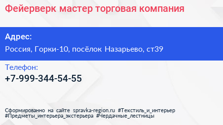 Фейерверк мастер, торговая компания по адресу Культурно-спортивный комплекс "Назарьевский", с37, А-106, Назарьево, Одинцовский городской округ, Московская область, Центральный федеральный округ, 143021, Россия в дальнейшем Организация, размещена в следующих категориях: