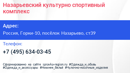 Назарьевский, культурно-спортивный комплекс по адресу Культурно-спортивный комплекс "Назарьевский", с37, А-106, Назарьево, Одинцовский городской округ, Московская область, Центральный федеральный округ, 143021, Россия в дальнейшем Организация, размещена в следующих категориях: