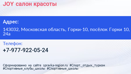 JOY, салон красоты по адресу 143032, Московская область, Горки-10, посёлок Горки 10, 24а в дальнейшем Организация, размещена в следующих категориях: