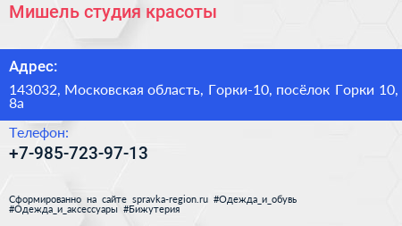 Мишель, студия красоты по адресу 143032, Московская область, Горки-10, посёлок Горки 10, 8а в дальнейшем Организация, размещена в следующих категориях: