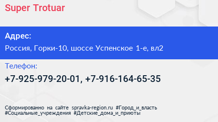 Super Trotuar по адресу вл2, 1-е Успенское шоссе, посёлок дома отдыха "Успенское", Сосны, Одинцовский городской округ, Московская область, Центральный федеральный округ, 143030, Россия в дальнейшем Организация, размещена в следующих категориях:
