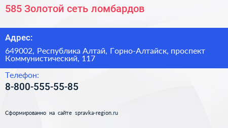 585*Золотой, сеть ломбардов по адресу 649002, Республика Алтай, Горно-Алтайск, проспект Коммунистический, 117 в дальнейшем Организация, размещена в следующих категориях: