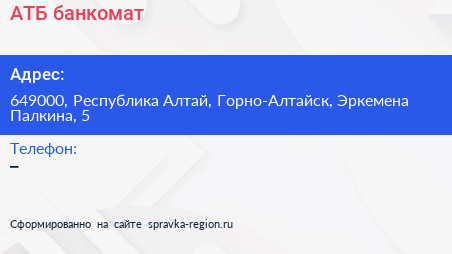 АТБ, банкомат по адресу 649000, Республика Алтай, Горно-Алтайск, Эркемена Палкина, 5 в дальнейшем Организация, размещена в следующих категориях: