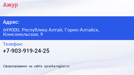 Ажур по адресу 649000, Республика Алтай, Горно-Алтайск, Комсомольская, 9 в дальнейшем Организация, размещена в следующих категориях: