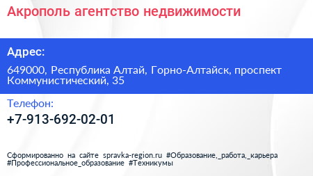 Акрополь, агентство недвижимости по адресу 649000, Республика Алтай, Горно-Алтайск, проспект Коммунистический, 35 в дальнейшем Организация, размещена в следующих категориях: