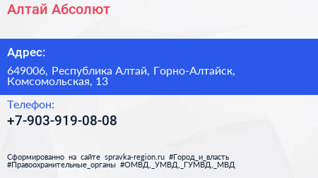 Алтай Абсолют по адресу 649006, Республика Алтай, Горно-Алтайск, Комсомольская, 13 в дальнейшем Организация, размещена в следующих категориях: