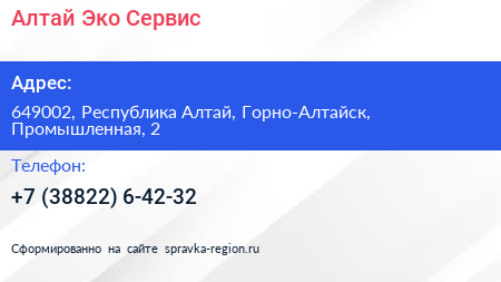Алтай Эко Сервис по адресу 649002, Республика Алтай, Горно-Алтайск, Промышленная, 2 в дальнейшем Организация, размещена в следующих категориях: