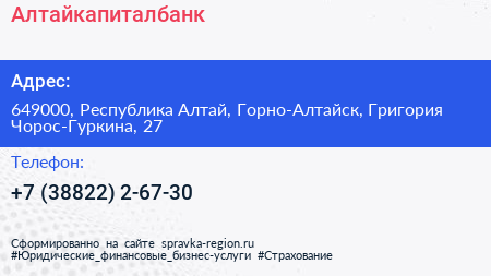 Алтайкапиталбанк по адресу 649000, Республика Алтай, Горно-Алтайск, Григория Чорос-Гуркина, 27 в дальнейшем Организация, размещена в следующих категориях: