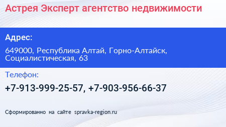 Астрея-Эксперт, агентство недвижимости по адресу 649000, Республика Алтай, Горно-Алтайск, Социалистическая, 63 в дальнейшем Организация, размещена в следующих категориях: