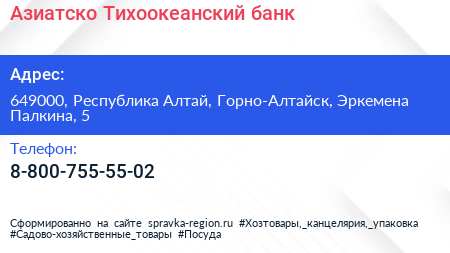 Азиатско-Тихоокеанский банк по адресу 649000, Республика Алтай, Горно-Алтайск, Эркемена Палкина, 5 в дальнейшем Организация, размещена в следующих категориях: