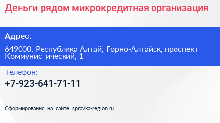 Деньги рядом, микрокредитная организация по адресу 649000, Республика Алтай, Горно-Алтайск, проспект Коммунистический, 1 в дальнейшем Организация, размещена в следующих категориях: