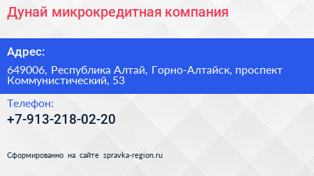 Дунай, микрокредитная компания по адресу 649006, Республика Алтай, Горно-Алтайск, проспект Коммунистический, 53 в дальнейшем Организация, размещена в следующих категориях:
