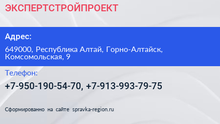 ЭКСПЕРТСТРОЙПРОЕКТ по адресу 649000, Республика Алтай, Горно-Алтайск, Комсомольская, 9 в дальнейшем Организация, размещена в следующих категориях: